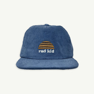 little child in a tan brown corduroy cap with the text 'rad kid' embroidered on the front, featuring a yellow logo