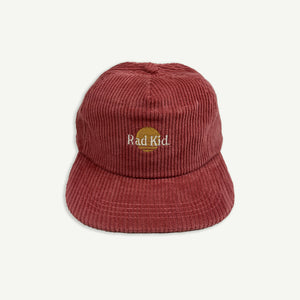 A tan brown corduroy cap with the text 'rad kid' embroidered on the front, featuring a yellow logo