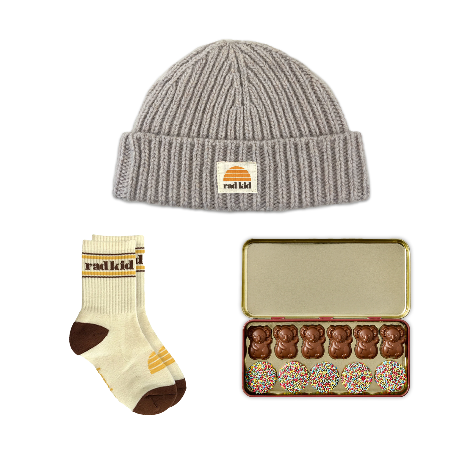 Rad Kid Easter Bundle #1 - Oat Beanie, Sock and Koko Koala's Outback Tin Milk Choc