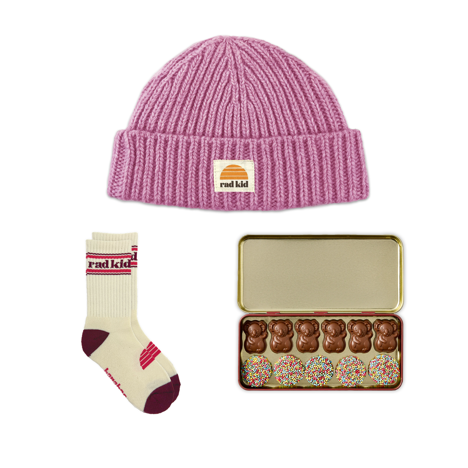 Rad Kid Easter Bundle #1 - Peony Pink Beanie, Sock and Koko Koala's Outback Tin Milk Choc